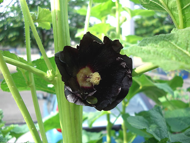 普通ホリホックの花は赤やピンクが主流で、時々白や黄色、紫なども見かけますが、このホリホックは黒い花が咲くのです。