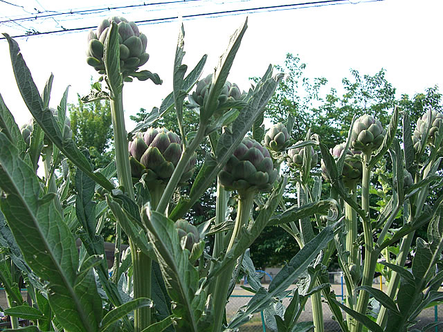 アーティーチョークはつぼみを食べるのですが、ここまでつぼみがゆるんでしまうと食べられないので、今年は全部花を咲かせることにしました。