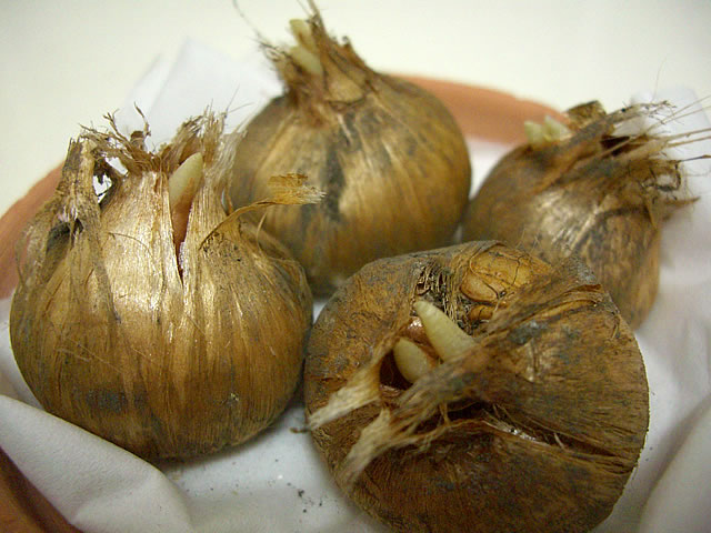 サフランは土に植えなくても、こうやって部屋の明るいところに置いておくだけで芽を出し、花を咲かせます。